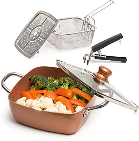 Moss Stone 5 Pcs Copper Chef Cookware Set, 9.5" Non Stick Deep Frying Pan, Fry Basket, Steamer Rack, Dishwasher Oven Safe, 5 Quart Deep Square Pan, Induction Copper Cookware Set(Copper)